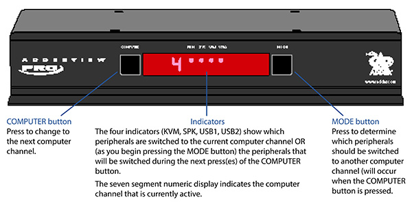 - Independent USB device selection: switching options enable the operator to use the keyboard and mouse on one computer whilst the USB peripherals are connected to other ones